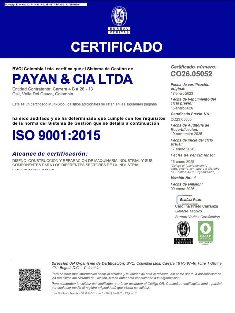 Estamos comprometidos con la calidad y nos encontramos certificados con la norma ISO 9001 por Bureau Veritas Certification en Colombia ONAC para el diseño, construcción y reparación de maquinaria industrial. Garantizando la calidad tanto de nuestros productos como servicios con los estándares internacionales.